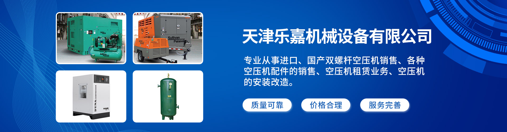天津樂嘉機械設備有限公司,成立于2011年,公司專業從事進口、國產雙螺桿空壓機銷售;各種空壓機配件的銷售;儲氣罐銷售:冷凍式干燥機銷售:車間管路設計與施工:空壓站的設計施工:并且配備專業技術人員進行機器的維修、維護與保養等業務;我公司還提供空壓機租賃業務;空壓機的安裝改造業務等。
